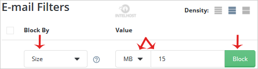If you have chosen size in MB and have entered the value 5, all emails exceeding 5MB in size will be blocked.