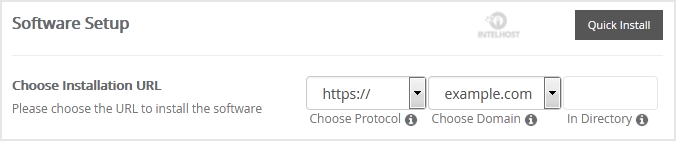 • Choose Installation URL: Choose the appropriate protocol/domain. Inside the «In Directory» field, should you want to install this in a directory, i.e. example.com/directory, enter the directory name. Otherwise, leave it blank to install in your main domain, i.e. example.com